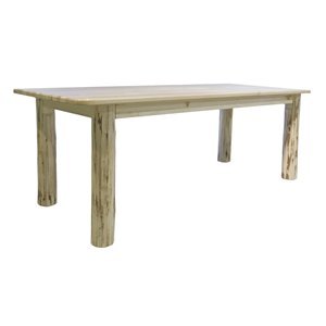 Finish:Clear Lacquer Montana Four Post Dining Table This table is handcrafted designed for years of practical use while adding to the beauty of dining room. Edge glued panels for a stable surface that will not warp or crack. The legs are hand peeled with old-fashioned draw knives for a rustic skip peeled look. All tables are either unfinished or varnished. Some assembly required.
