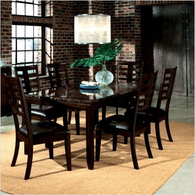 16841 / 16844 Features: -Includes dining table and 6 side chairs. -Bella collection. -Deep brown finish. -Veneers and wood construction. -Faux marble travertine tops. -Can comfortably seat six. -Seat cushions are vinyl brown color. -Assembly required. -Manufacturer provides one year warranty.