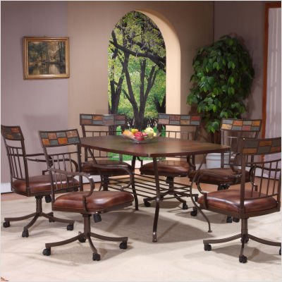 Shown with optional bakers rack, sold separately. Earth inspired textures and colors combine to create Hillsdale Furniture's Montero dining collection. This unique group is a perfect addition to your home. Includes: 1 x Trebec/Montero Rectangle Dining Table with Wood Top (4269DTBRT) 2 x Montero Slate Dining Chair (Set of 2) (4266-804) 4266DTBCRT7 Features: Striking fusion of wood, coppery brown metal, and dynamic patterned slate motif in the chair backs Comfort of castered chairs Easy to maintain and versatile brown faux leather seats Transitional design elements Composed of heavy gauge tubular steel, solid wood edges, climate controlled wood composites and veneers Finish: Copper Dimensions: Table: 66"(W) x 42"(D) x 30"(H) Chair: 27.5"(W) x 27.5"(D) x 39"(H)